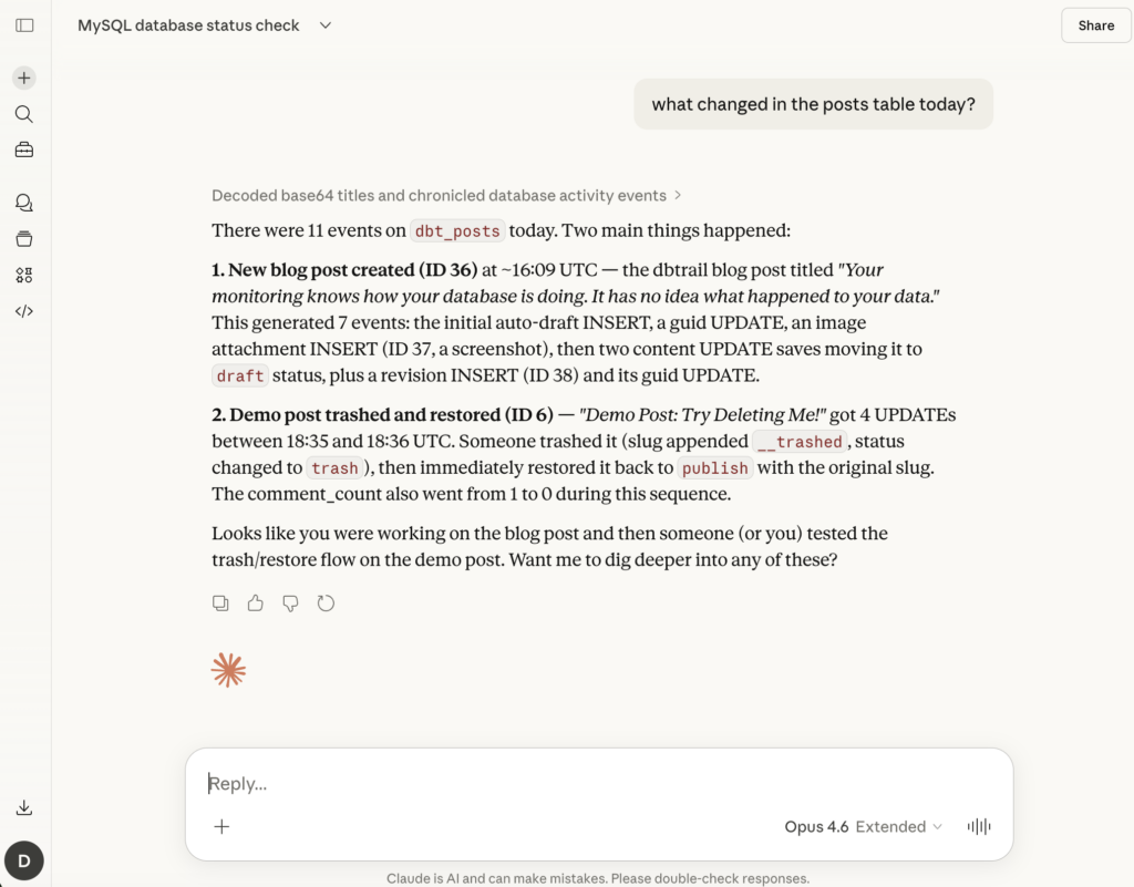 “How is my database doing” is about infrastructure. “What happened to my data” is about rows. Actual rows, with actual values, that changed at a specific time. Your monitoring stack has zero visibility into this. Datadog can tell you that writes per second spiked at 3pm. It can’t tell you which rows were affected or what the values were before.