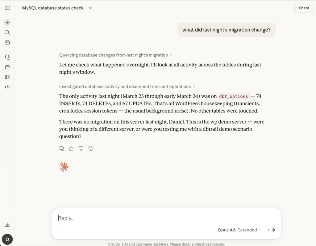 First, MCP (Model Context Protocol) made it possible to interact with data tools through natural language. Instead of memorizing mysqlbinlog flags or writing complex queries, you can literally say “show me what changed in the orders table after the deploy” and get a structured answer. The interface became conversational.