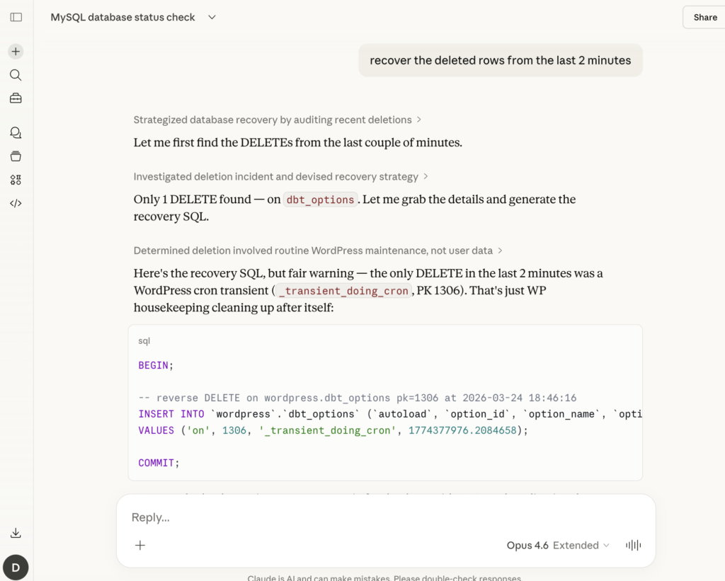 And yeah, when something does break, having the full row history means you can generate recovery SQL automatically. Someone runs a bad DELETE? You don’t need to restore a 500GB backup to get those 3 rows back. The before-images are right there. Generate an INSERT, review it, run it. Done.