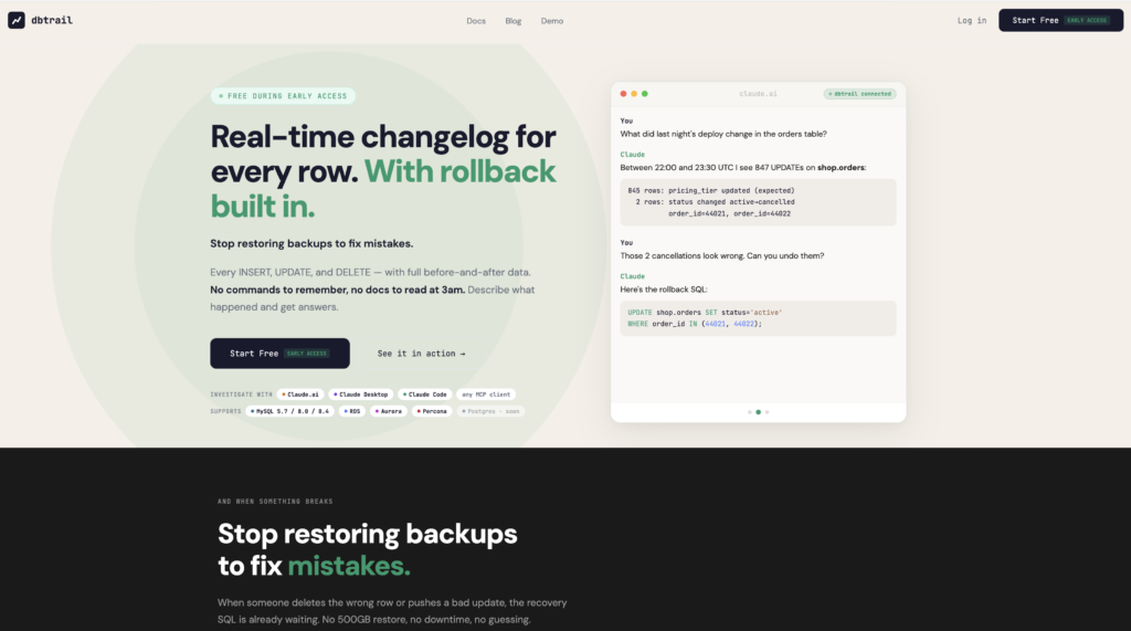 It’s free during early access. No credit card. If you’ve ever spent 2 hours restoring a backup to find 3 deleted rows, you know why we built this.